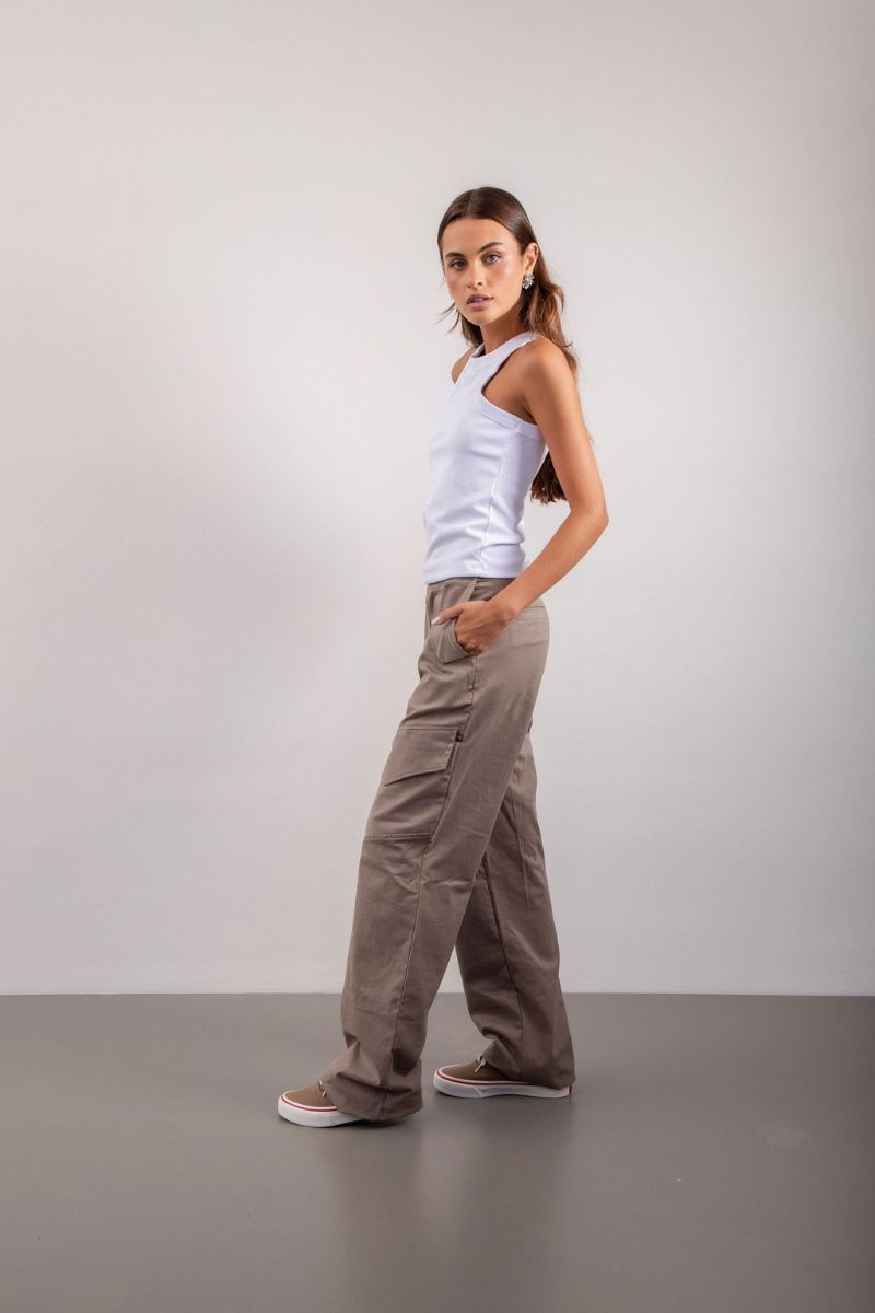 Detalhes: Calça cargo sarja, com bolso, fechamento com zíper e botão.